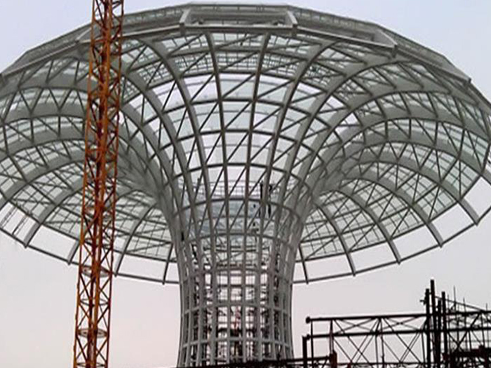 二、球形网架结构因其结构新颖,受力合理,自重轻、用钢量低等优点。如大型体育场馆球形重庆螺栓球网架、公共场馆球形网架、电厂重庆螺栓球网架、水泥工业球形网架、仓储物流球形网架、重庆干煤棚工业球形网架、重庆收费站重庆加油站球形网架、展览中心、影剧院、商场、航站楼、候车厅、工厂重庆车间、仓库、电视塔等球形螺栓球节点网架。国内球形网架结构主要分为:重庆焊接球节点网架及螺栓球节点网架两种。螺栓球节点网架其构件工厂内加工量较大,现场安装便捷,适用于现场工期紧,重庆施工条件、用电量受制约,网架形状复杂、重庆杆件定位困难的异形结构。螺栓球节点球形网架系统基本由重庆杆件、螺栓球、支撑支座等组成。按照节点形式可分为交叉重庆桁架体系、四角锥体系、三角锥体系等。支撑方式多为固定支座支撑。对于大面积、大跨度及有特殊受力或伸缩要求的网架结构可采用橡胶支座、滑移支座、球铰支座等支撑形式,以满足结构自身的受力稳定、均衡,便于内力释放等设计要求。